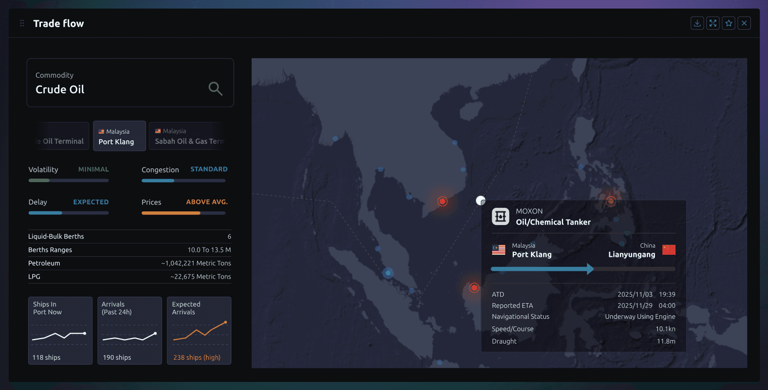 Maps the real movement of goods, ships, commodities, and value chains in/out of Malaysia and the region.