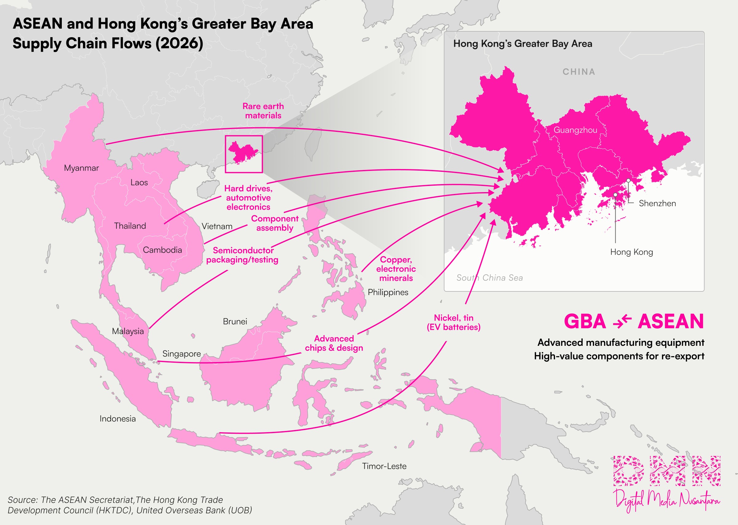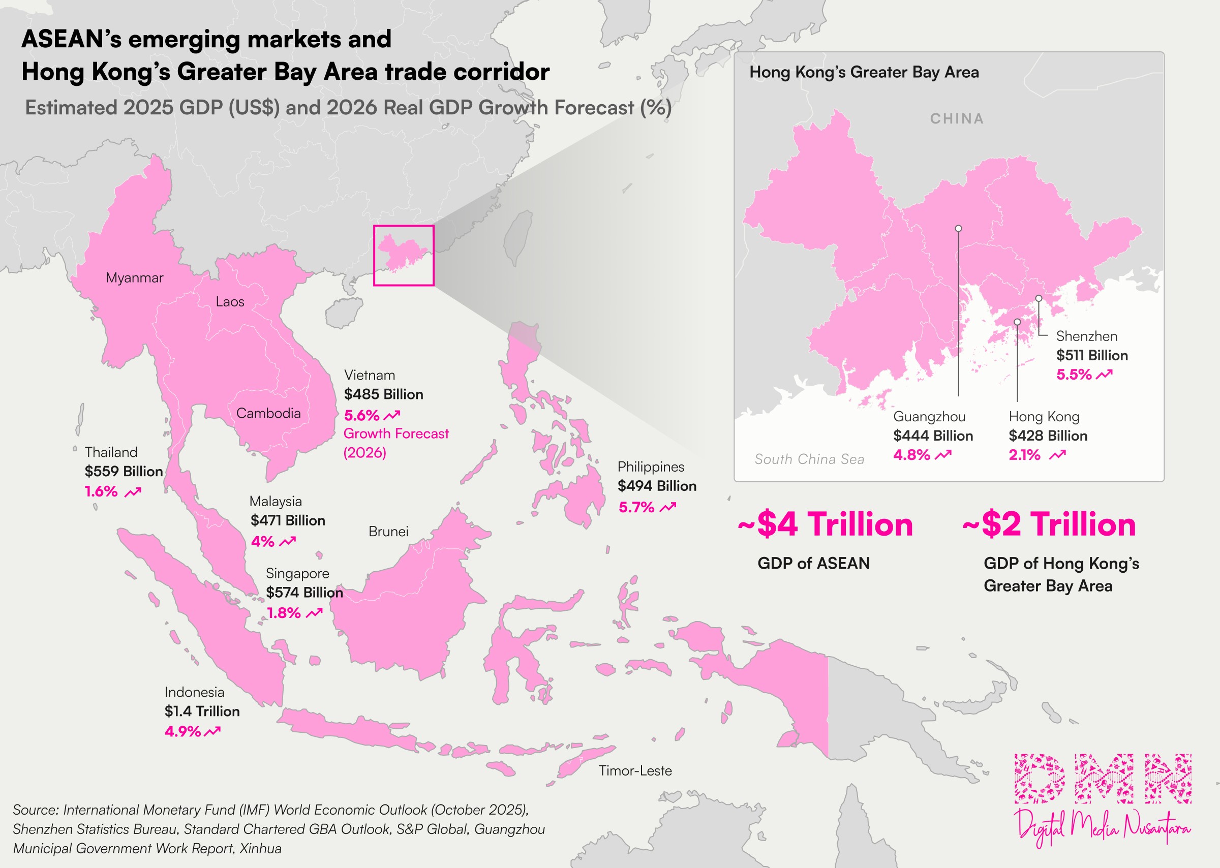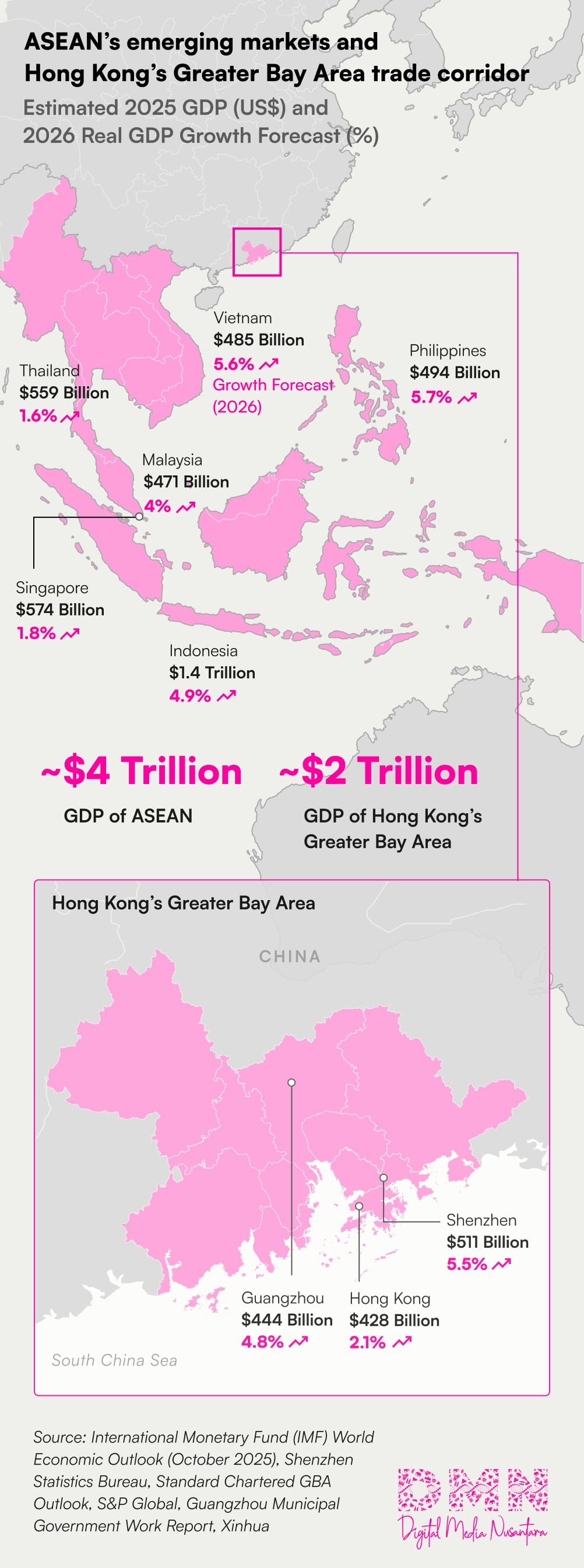 The ASEAN–Greater Bay Area (GBA) corridor links one of the world’s largest emerging markets with a leading Chinese economic hub. ASEAN now constitutes a $3.9 trillion economy with 678 million people, while China’s GBA (11 cities including Hong Kong and Shenzhen) adds 86 million people in a top-tier finance and technology cluster.